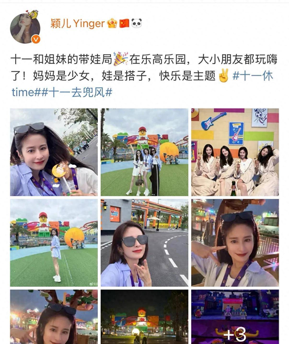国庆假期的欢乐浓度有多高?看看颖儿和闺蜜的“带娃局”就知道了!10月1日,颖儿在社交平台分享了一组充满欢笑的游乐场大片,并开心写道:“十一和姐妹的带娃局在乐高乐园,大小朋友都玩嗨了!妈妈是少女,娃是搭子,快乐是主题。”这哪里像是妈妈带娃出游,分明就是一场姐妹淘的青春派对!