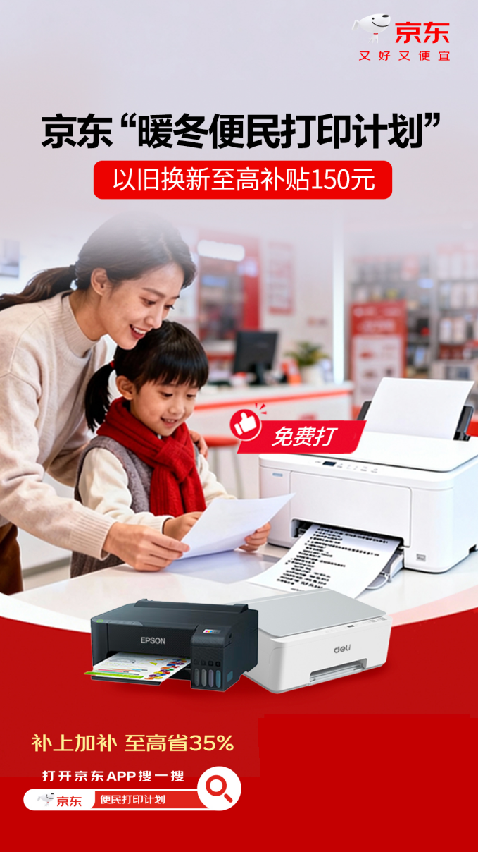 为了满足考试季期间旺盛的打印机购买需求,京东同步推出“以旧换新至高补贴150元”的优惠活动,有需求的朋友们打开京东APP搜索“便民打印计划”即可直达活动会场入手新装备,体验“孩子作业随时打,不用半夜跑出门”的便捷性,享受“一张成本几分钱,省心又省钱”的经济效益。
