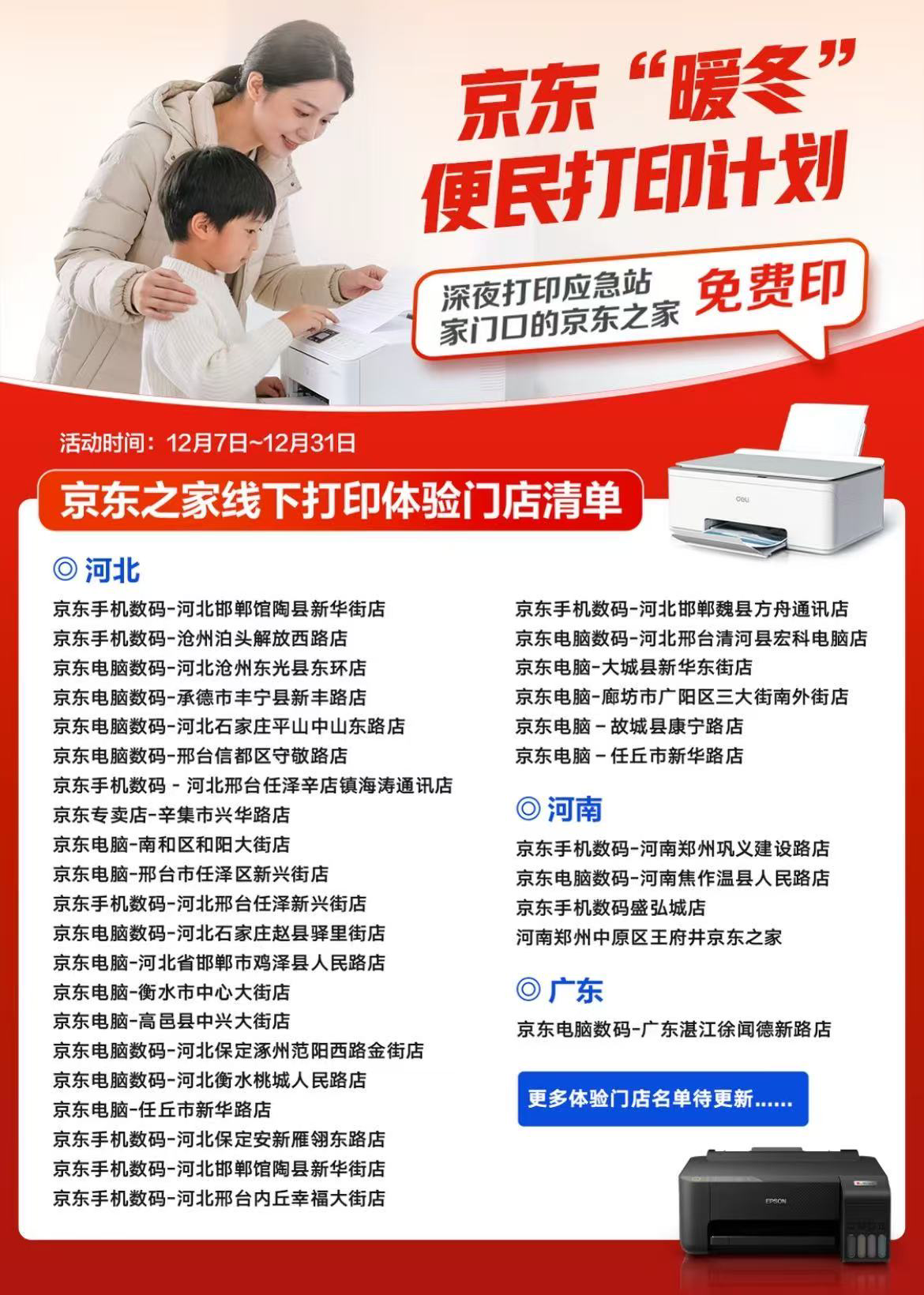 随着期末考试季临近,不少家长都曾遇到这样的困扰:深夜孩子复习资料急需打印,却找不到还在营业的打印店。即日起至12月31日,京东启动“暖冬便民打印计划”,在全国超百个城市为用户提供便捷打印支持。目前该活动已覆盖河北、河南、广东等多个地区,打开京东APP搜索“便民打印计划”即可查看附近京东之家活动门店清单,享受免费打印服务的同时,还有以旧换新至高补贴150元等优惠助消费者入手超值打印装备。